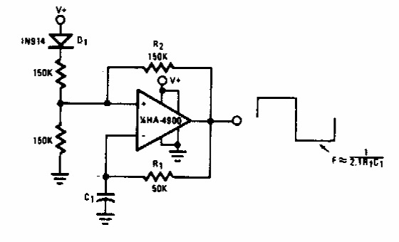 Indicado para ser usado como clock, este circuito foi encontrado em documentação antiga. O operacional da época pode ser substituído por um equivalente moderno.