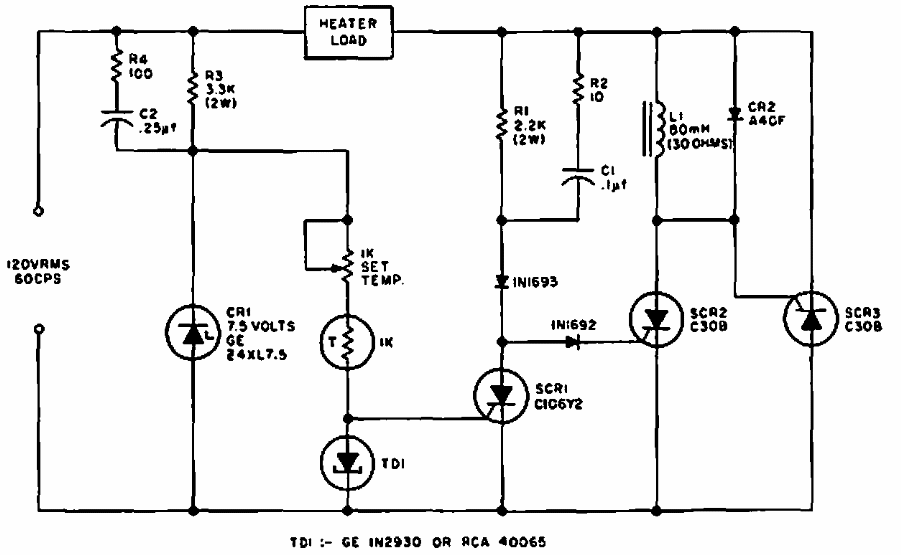 Este circuito foi obtido num manual de SCRs da GE de 1967. Os SCRs devem ser de acordo com a potência do elemento de aquecimento controlado.