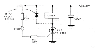 O circuito da figura mostra a sensibilidade do SCR da série 106 e de que modo podemos usá-lo no controle de cargas a partir de baixas correntes. Se em lugar do sensor usarmos LDRs ou outros transdutores, podemos transformar este circuito em alarmes de luz etc. A carga tanto pode ser o aparelho alimentado, como um relé, como no circuito com este componente, dado no item sobre transistores unijunção. O sensor consiste em duas chapinhas de metal, que devem ser tocadas simultaneamente para haver o disparo.