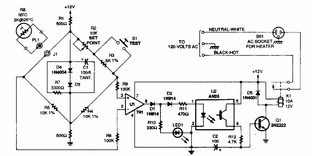 Este circuito foi encontrado numa Popular Electronics dos anos 90. Os componentes são comuns. O potenciômetro ajusta o ponto de disparo do circuito.