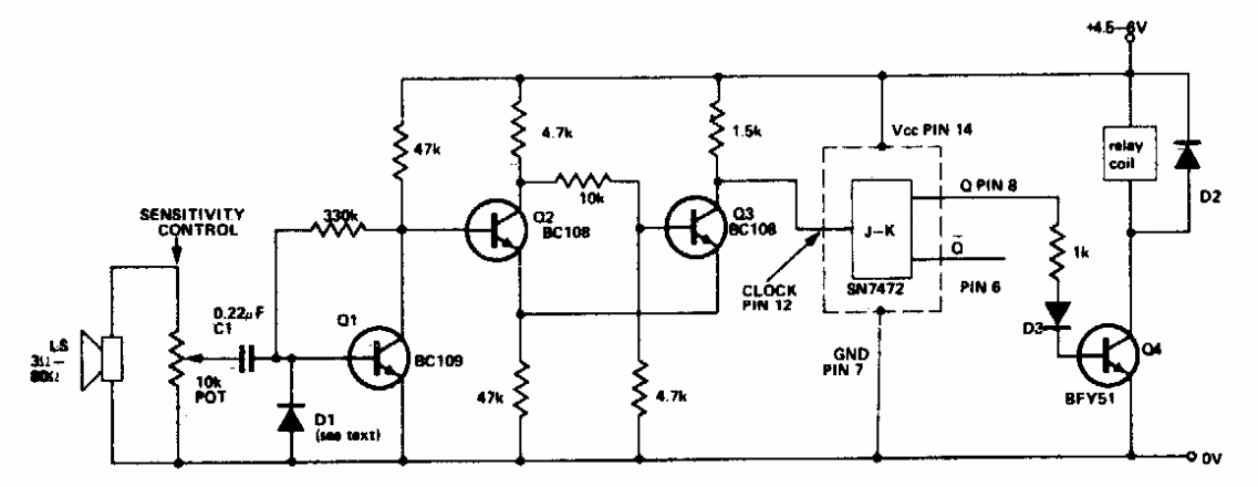 Encontrado numa documentação americana antiga, este circuito admite o uso de transistores equivalentes. O circuito aciona dois relés alternadamente a partir do sinal captado por um microfone.