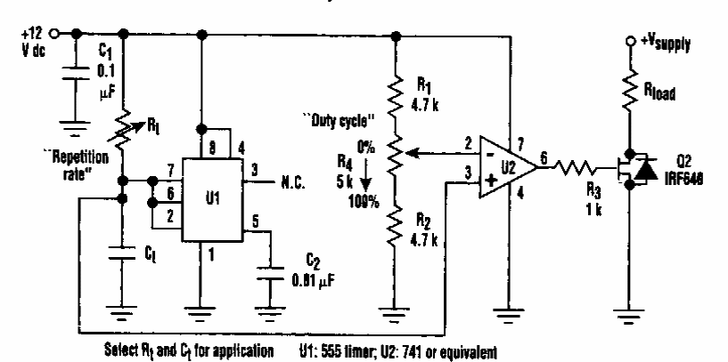 Encontrado numa Electronic Design dos anos 90, este circuito gera sinais com ciclo ativo controlado. A frequência depende do capacitor sem valor indicado e do ajuste do potenciômetro junto ao 555.