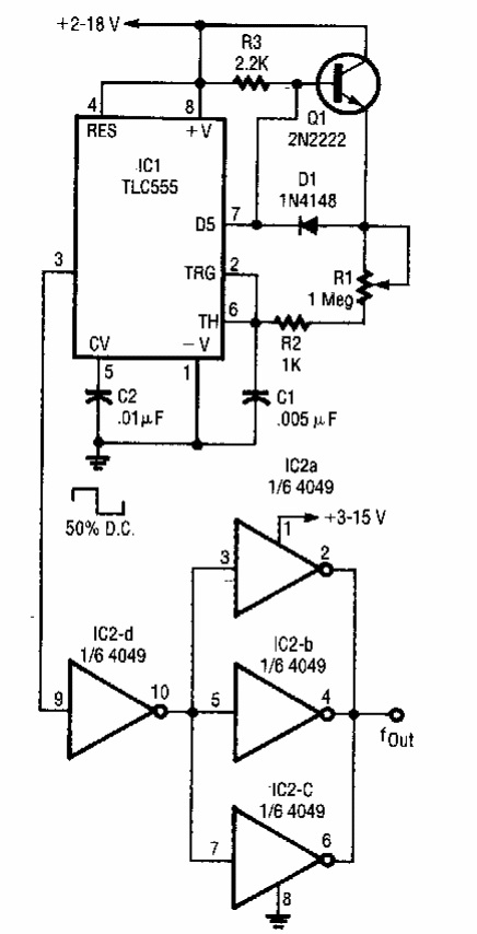 Encontrado numa Electronics Now dos anos 90, este circuito com o 555 gera um sinal com 50% de ciclo ativo. A frequência é ajustada em R1.