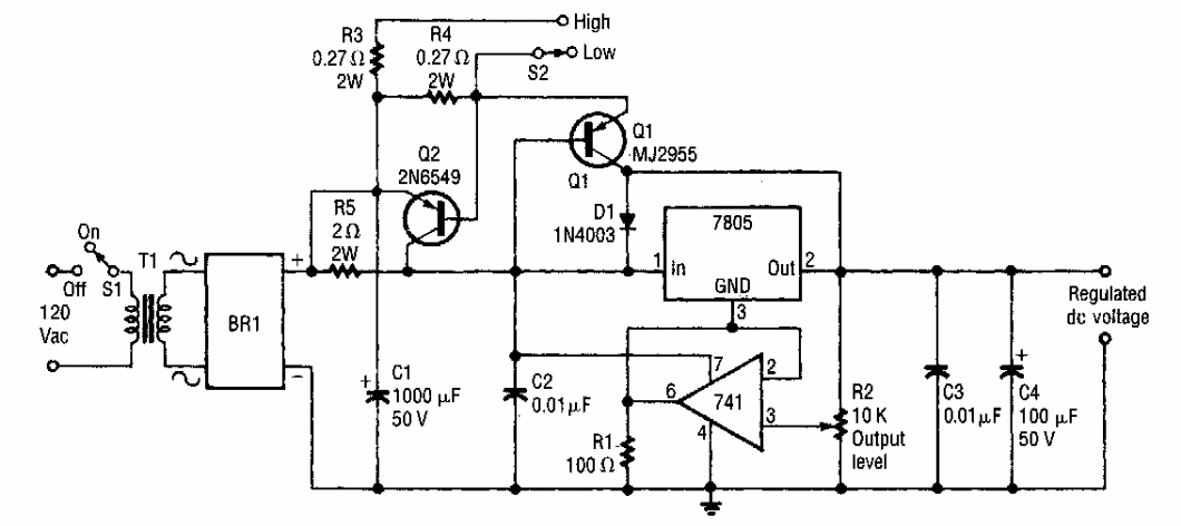 Este circuito foi encontrado numa Electronics Now dos anos 90. O circuito integrado regulador e o transistor de potência devem ser dotados de radiadores de calor.