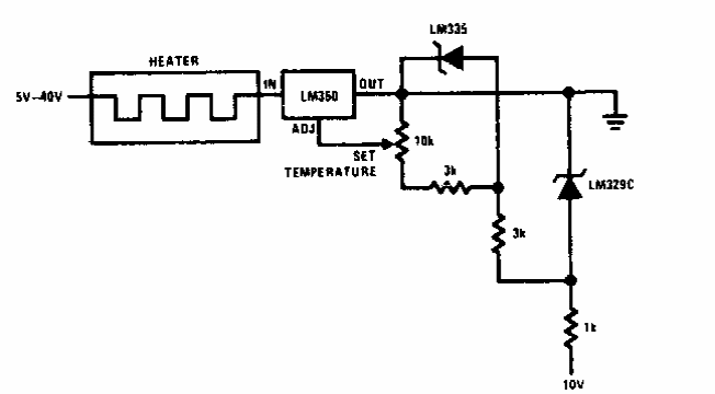 Este circuito faz uso de uma fonte de corrente constante para controlar a temperatura de um elemento de aquecimento de corrente contínua. O circuito integrado deve ser dotado de dissipador de calor.