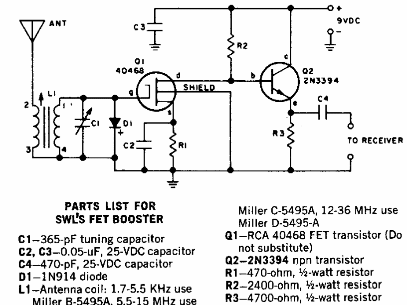 MOSFETs equivalentes podem ser experimentados neste circuito dos anos 80. Ele amplifica sinais de 3,5 a 30 MHz com um ganho de 40 dB. O consumo é muito baixo.
