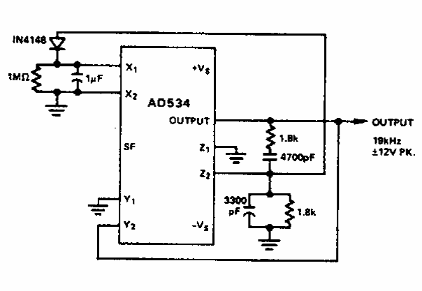 Este oscilador em ponte de Viena foi encontrado numa documentação da Analog Devices dos anos 90. O circuito integrado usado é pouco comum em nossos dias.