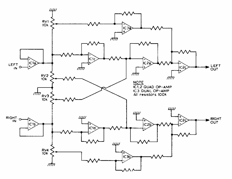 Este circuito foi obtido numa documentação sobre música eletrônica dos anos 70. Todos os resistores usados neste circuito são de 100k. A fonte de alimentação deve ser simétrica.