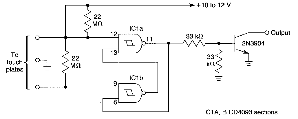 Encontrada numa documentação americana, esta chave tem por base o 4093. A carga determinará a tensão de alimentação. O transistor é de uso geral.
