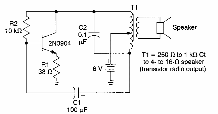 Encontrado numa documentação americana dos anos 90, este circuito faz uso de um transformador de saída para transistores, funcionando com alimentação de 6 V.