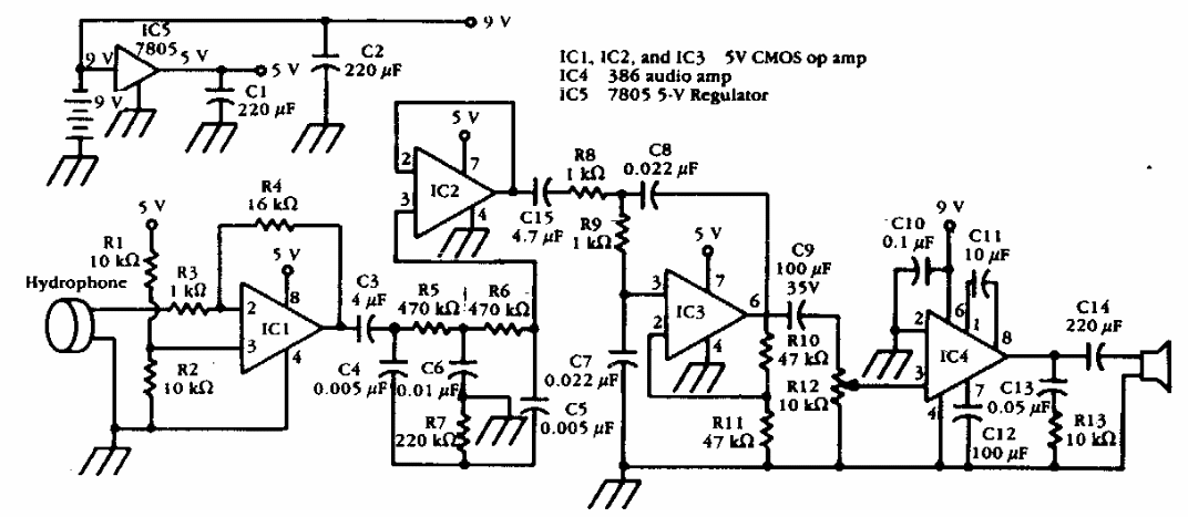 Este circuito permite a audição de sons submarinos usando um transdutor especial. Os amplificadores operacionais podem ser de qualquer tipo. O circuito foi encontrado numa Popular Electronics dos anos 90.