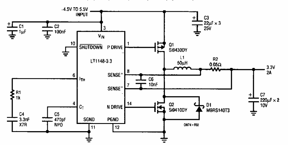 Encontrado numa documentação da Linear Technology dos anos 90, este circuito dissipa 1,5 W com uma saída de 3,3 V x 2 A. O circuito integrado usado é da época.
