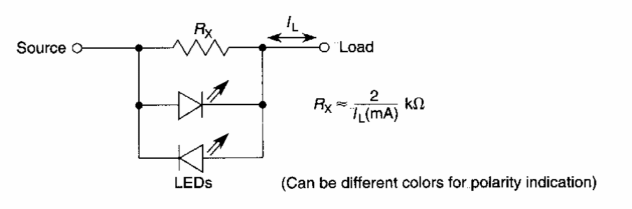 Este circuito bidirecional foi encontrado numa documentação americana dos anos 80. Os LEDs são vermelhos comuns e o resistor é calculado segundo as fórmulas junto ao diagrama.