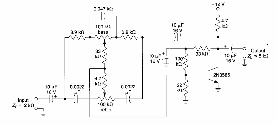 Este circuito de controle de tom ativo foi encontrado em documentação americana dos anos 90. O transistor pode ser de uso geral ou baixo ruído com alto ganho.