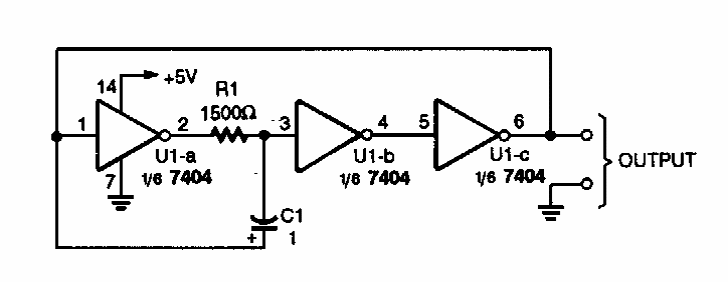 Este oscilador TTL de 1 kHz utiliza 3 inversores de um circuito integrado 7404. O circuito é de uma Popular Electronics dos anos 90.