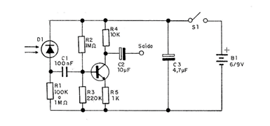 Se modularmos um feixe de luz de um LED, por exemplo, podemos receber este feixe de luz à distância e converter novamente em som. Esta é a base de um sistema de comunicações ópticas. O projeto que damos em seguida é de um receptor, que deve ter sua saída ligada na entrada de qualquer bom amplificador. Qualquer fotodiodo pode ser usado e o alcance vai depender da intensidade do sinal transmitido e da existência de recursos ópticos, como por exemplo lentes. A fixação do fotodiodo no foco de uma luneta, por exemplo, possibilita a extensão do alcance para até mais de 1 Km em condições favoráveis de visibilidade e à noite.