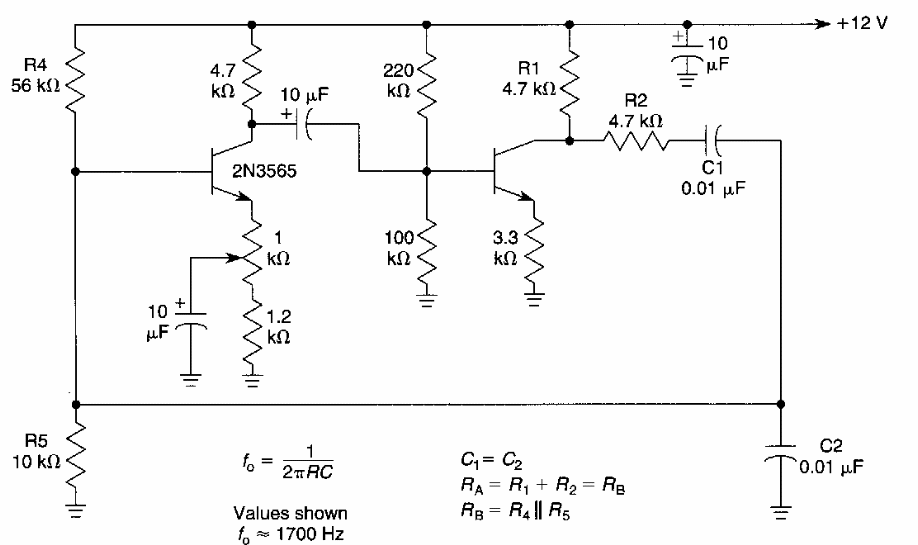 Este circuito foi encontrado numa documentação americana antiga. Trata-se de uma ponte de Viena com os valores dos componentes calculados pelas fórmulas junto ao diagrama.