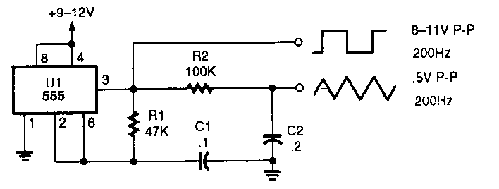 Este circuito, com base num 555, foi encontrado numa Popular Electronics dos anos 90. O circuito tem a frequência determinada por R1, R2 e C1.