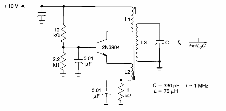 Este oscilador com acoplamento indutivo foi encontrado numa documentação americana dos anos 90. O circuito com os componentes indicados gera um sinal de 1 MHz L1 tipicamente tem 10 vezes o número de espiras de L3.