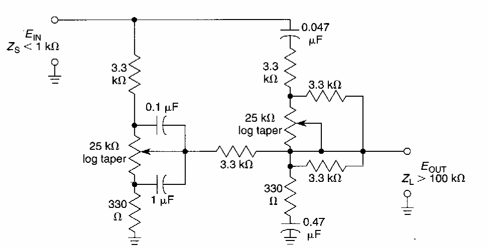 Este circuito passivo pode ser usado em etapas de entrada de amplificadores e outros equipamentos de áudio. O circuito é passivo introduzindo perdas que devem ser compensadas.