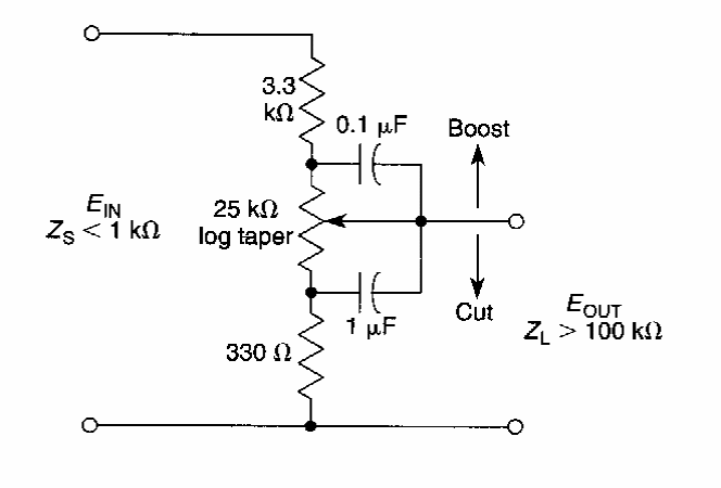 Este circuito com perdas de 20 dB em 350 Hz foi encontrado numa documentação antiga, mas se aplica a circuitos modernos de pré-amplificadores e amplificadores.