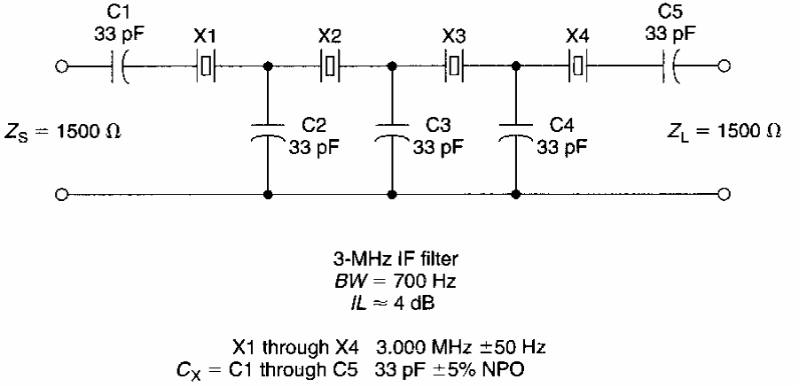 Encontrado numa documentação americana dos anos 80, este circuito tem uma faixa passante de 700 Hz e uma resposta plana de 400 a 500 Hz, sendo os cristais de 3 MHz. Podem ser usados cristais de 2 a 15 MHz.