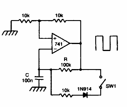 Este circuito foi encontrado em documentação antiga, podendo ser empregados outros operacionais. A fonte de alimentação deve ser simétrica. O sinal de saída é retangular.