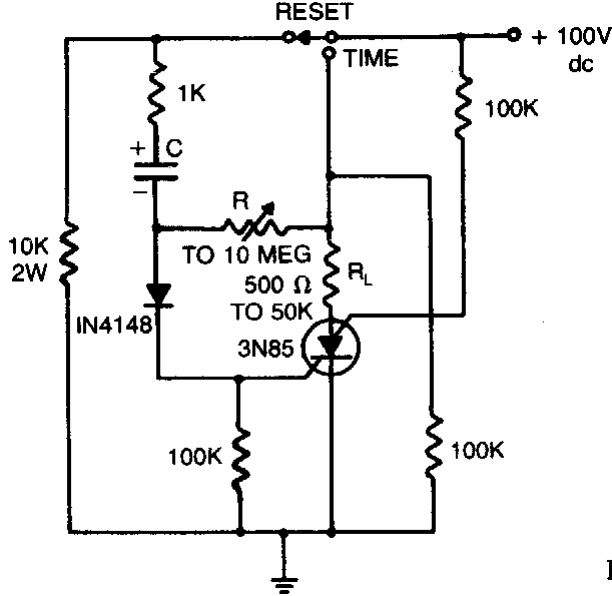 O PUT usado neste circuito não é um componente comum atualmente. O tempo de disparo é dado pelo resistor de 100k e o capacitor C. Observe a alta tensão de alimentação.