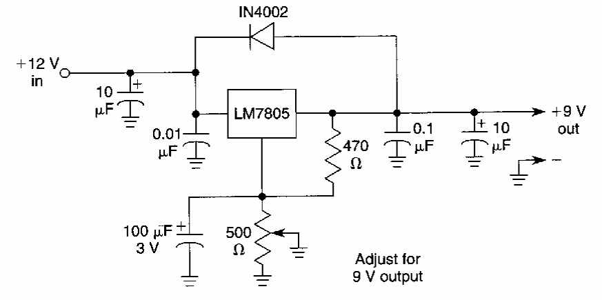 Na figura temos uma fonte de 9V usando um regulador 7805 de 5 V. O circuito é de uma documentação americana dos anos 90. O circuito tem entrada de 12V. A corrente máxima é de 1 A.