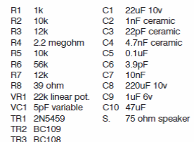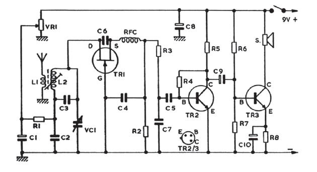 Encontramos este receptor numa documentação inglesa antiga. O JFET é de uso geral e os bipolares podem ser os BC548. Não foram dadas informações sobre as bobinas.