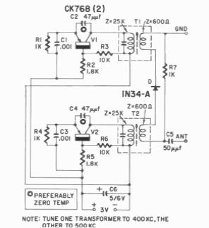Este circuito produz sinais com harmônicas para 600, 700, 800 kHz possibilitando a calibração de receptores de ondas curtas. O circuito é de uma documentação de Gernsback de 1960.