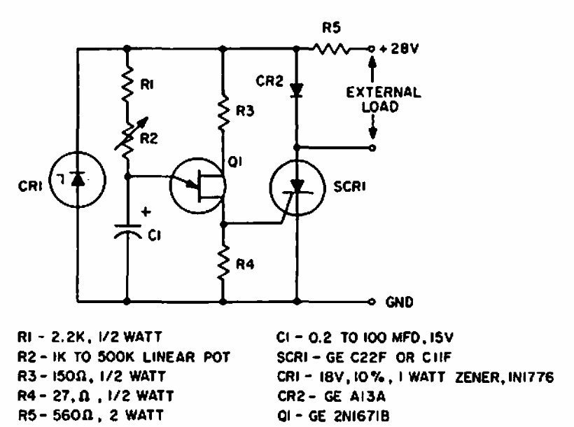 Este circuito foi obtido no Manual de SCRs da General Electric de 1967. O circuito pode usar praticamente qualquer unijunção e SCR de acordo com a carga.
