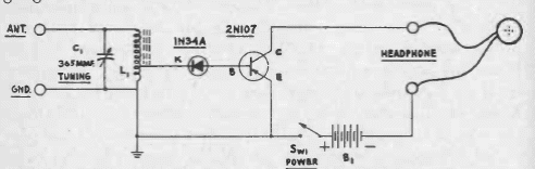 Encontrado numa documentação de 1956, este receptor usa um transistor de germânio de época e um fone magnético de alta impedância. A bobina pode ter de 80 a 100 espiras com tomada na vigésima a partir do lado do terra.