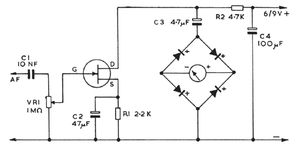 Encontramos este circuito numa documentação inglesa antiga. O JFET pode ser qualquer de uso geral e o instrumento um microamperímetro de 50 ou 100 uA.