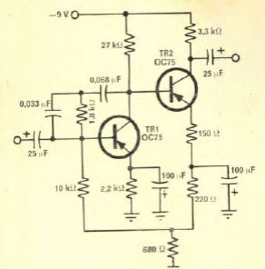 Este circuito foi encontrado em uma Eletrônica Popular de novembro/dezembro de 1968. A realimentação determina a curva de resposta. Os transistores são de germânio da época.