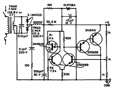 Encontramos este circuito numa Electronic Design de 1967. O circuito usa transistores da época que podem ser substituídos por equivalentes modernos. A tensão de saída é de 5 V.