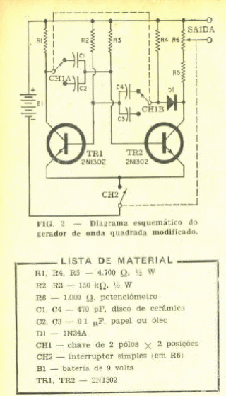 Este multivibrador astável foi obtido numa Eletrônica Popular de agosto de 1967. Os transistores são tipos de germânio da época e as frequências são selecionadas em duas faixas pela troca dos capacitores.