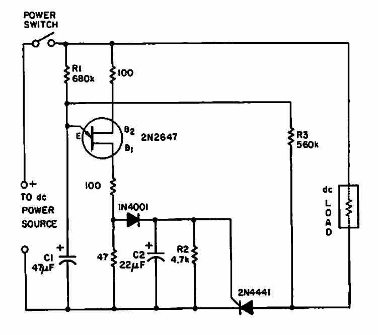 Encontrado numa documentação de 1969, este circuito alimenta uma carga depois de um intervalo dado por R1 e C1. Esses componentes podem ser alterados para outros tempos.