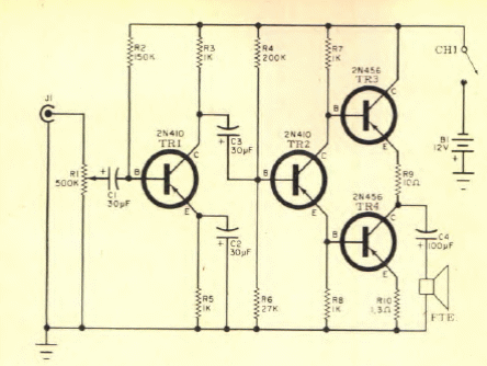 Este circuito com transistores PNP de potência na saída, fornece algumas centenas de miliwatts. Encontramos numa Eletrônica Popular de março de 1968. Os transistores são da época.