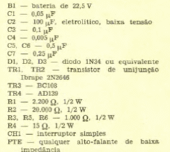 Este circuito de sirene foi encontrado numa Eletrônica Popular de março/abril de 1969. Podemos facilmente fazer sua montagem com componentes equivalentes modernos.