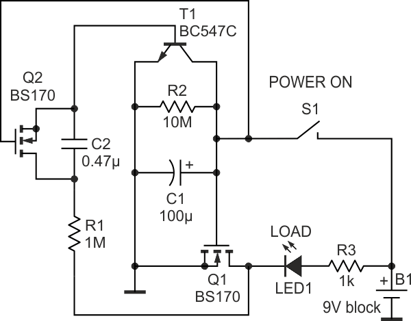 Este temporizador com transistores de efeito de campo foi obtido em documentação da Fairchild. Os tempos dependem dos capacitores podendo ir até 25 minutos com os valores indicados no diagrama.