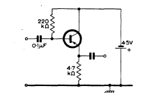 Este é um circuito típico de etapa de emissor comum para transistor de uso geral. A alimentação é de 4,5 V e a corrente de coletor de 0,5 mA. O circuito é de um manual Mullard de 1960.