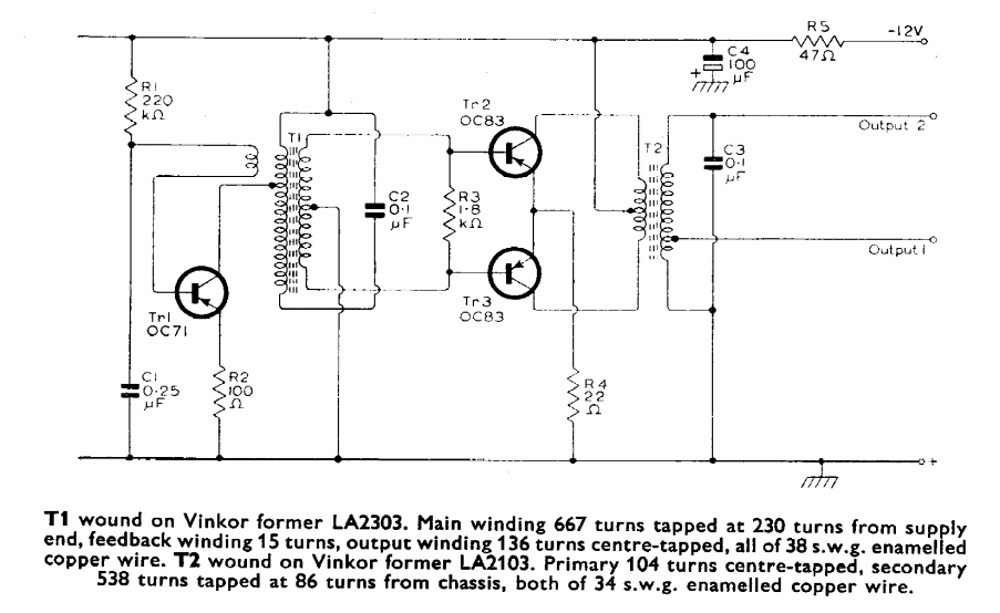 Este circuito foi obtido no manual Mullard de transistores de 1960. As informações sobre as bobinas são dadas junto ao diagrama.