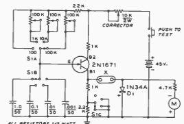 Este circuito foi encontrado numa documentação de 1977. Ele consiste numa ponte de capacitâncias usando um indicador de 50 uA de fundo de escala.