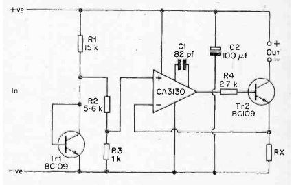 Este circuito pode limitar uma corrente numa carga. O circuito é de uma publicação de 1977. O amplificador operacional é o CA3130 e o transistor pode ser um BC549 para 100 mA de corrente máxima e um BD135 para 500 mA.