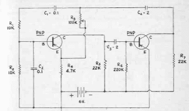 Este oscilador por ponte de Viena foi encontrado numa documentação americana de 1956. Os transistores são de germânio da época. Os capacitores indicados determinam a frequência. O sinal é senoidal.