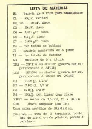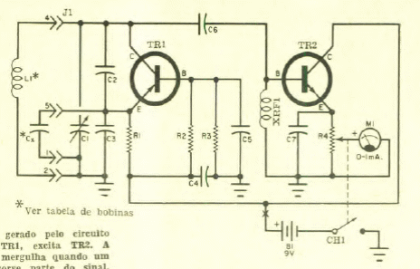Esta versão transistorizada de um grid-dip-meter foi encontrada numa Eletrônica Popular de junho de 1968. Os transistores são a época e as bobinas assim como o capacitor de sintonia dependem da frequência.