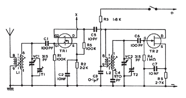 Encontramos este circuito numa documentação inglesa antiga. Os transistores admitem equivalentes modernos. O circuito converte sinais da faixa de 5 a 15 MHz para a sintonia num rádio de ondas médias comum.