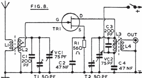 Este circuito se destina a amplificação de sinais na faixa de 1,8 a 20 MHz. O transistor pode ser um BF245 ou MPF102. Encontramos numa documentação inglesa antiga.