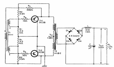 Encontrado num manual de transistores Mullard de 1960, este circuito tem uma corrente de entrada de 4,4 A e saída de 193 V operando em 514 Hz. Não são dadas informações sobre o transformador.